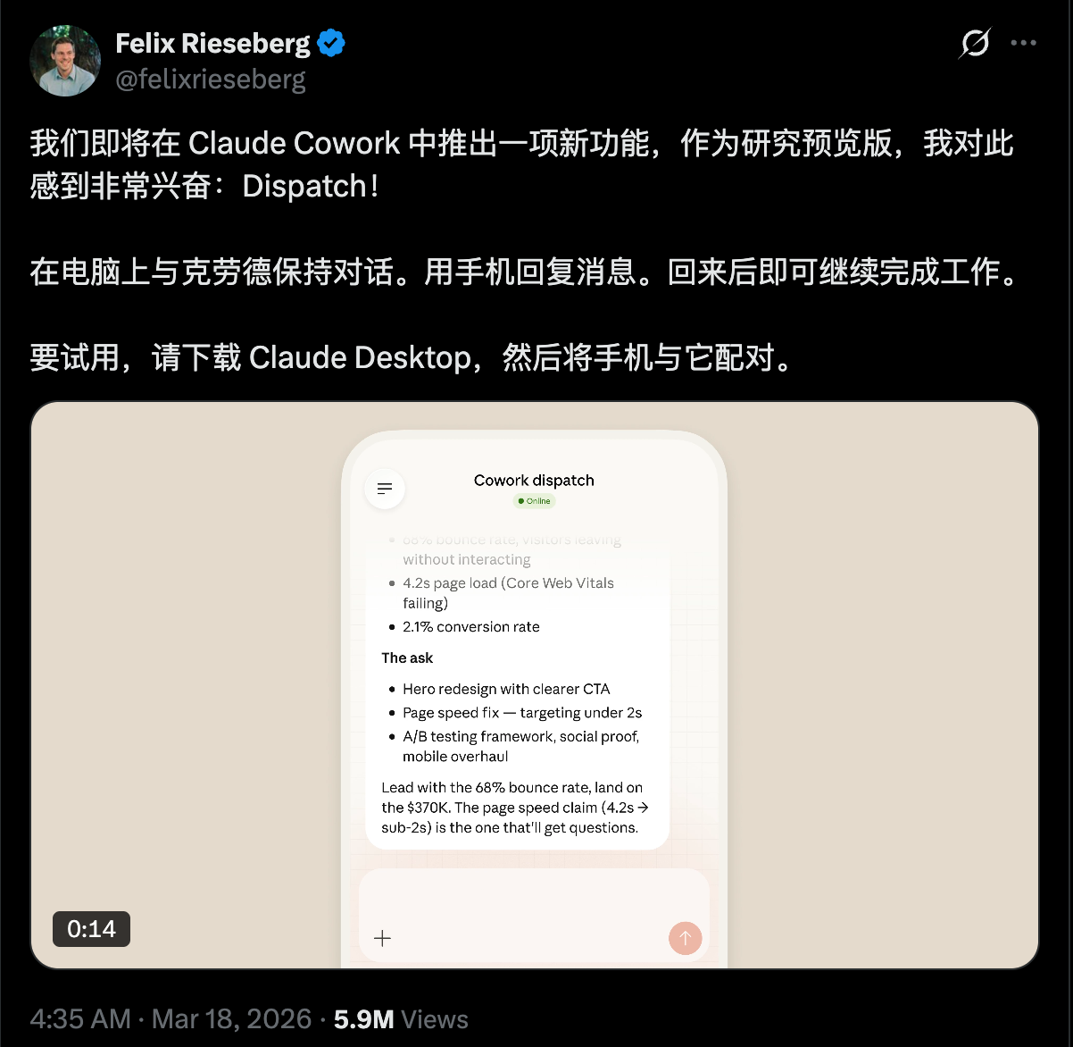 - Anthropic 疯狂打钉子:Claude Code 连续推出 Cowork(接管本地文件夹读写)、Dispatch(远程遥控桌面端)和 Channels(通过 Discord/Telegram 直接派活)。两个月三步棋,招招致命。