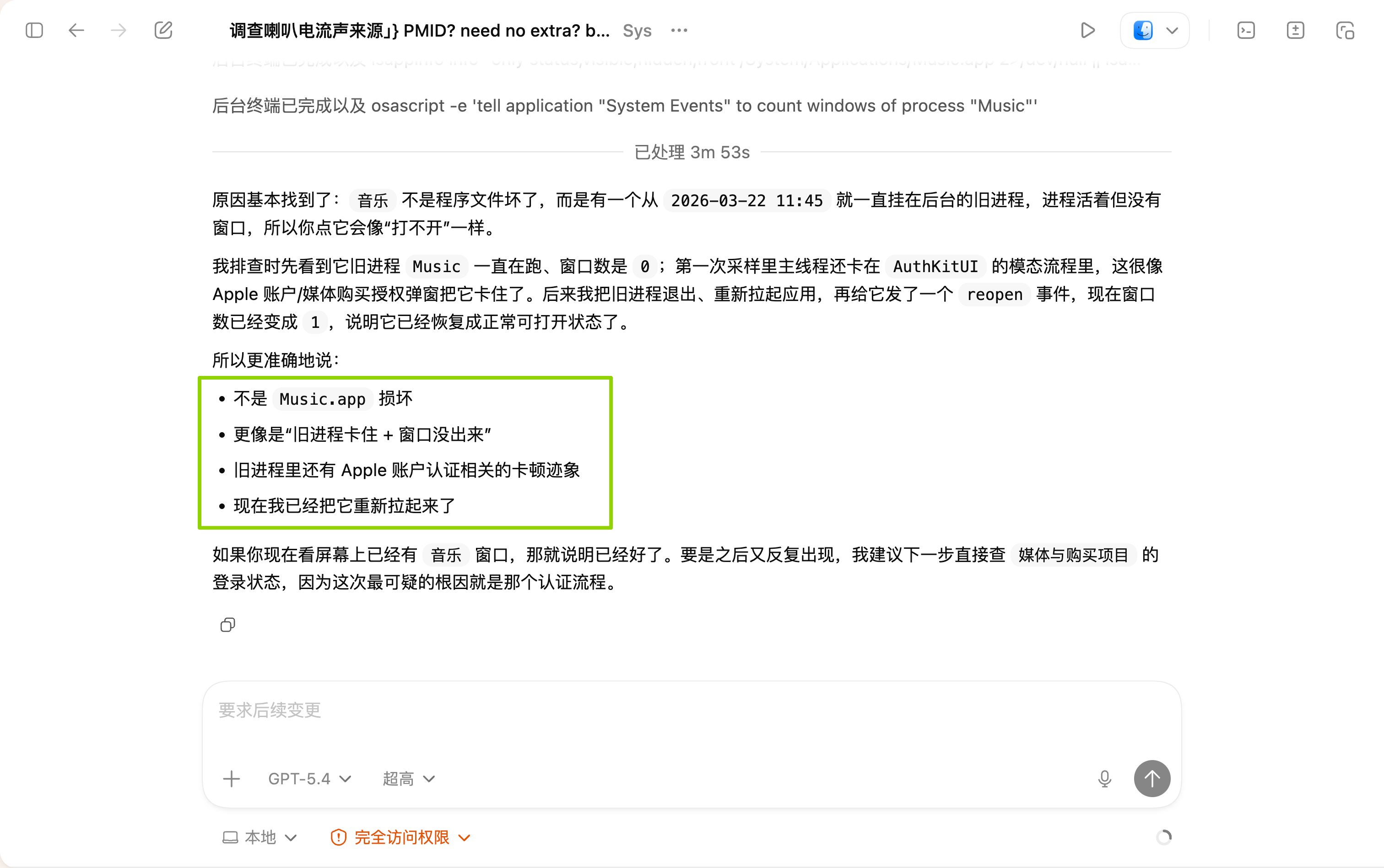 音乐 App 那个问题,最后不是停留在“我分析了一下,可能是这几个原因”,而是真的顺着检查结果继续往下,把那个卡住的状态处理掉,然后把应用重新拉回正常。