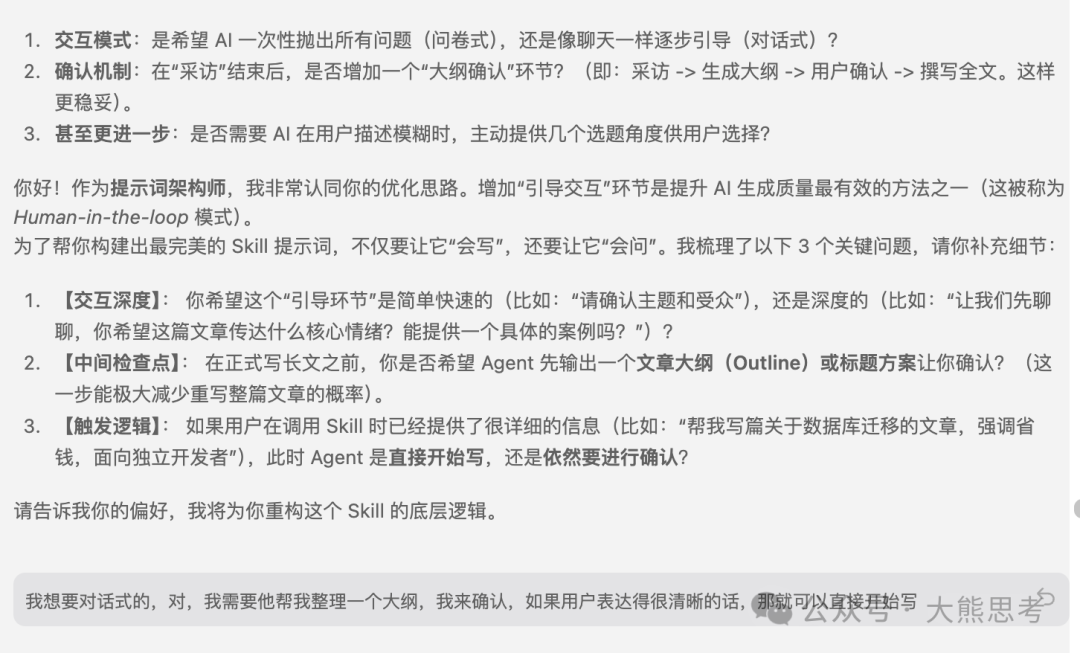 “我觉得现在的写作 Skill 不太好,没有跟我沟通就开写了。我希望它写之前先引导我聊聊主题。”